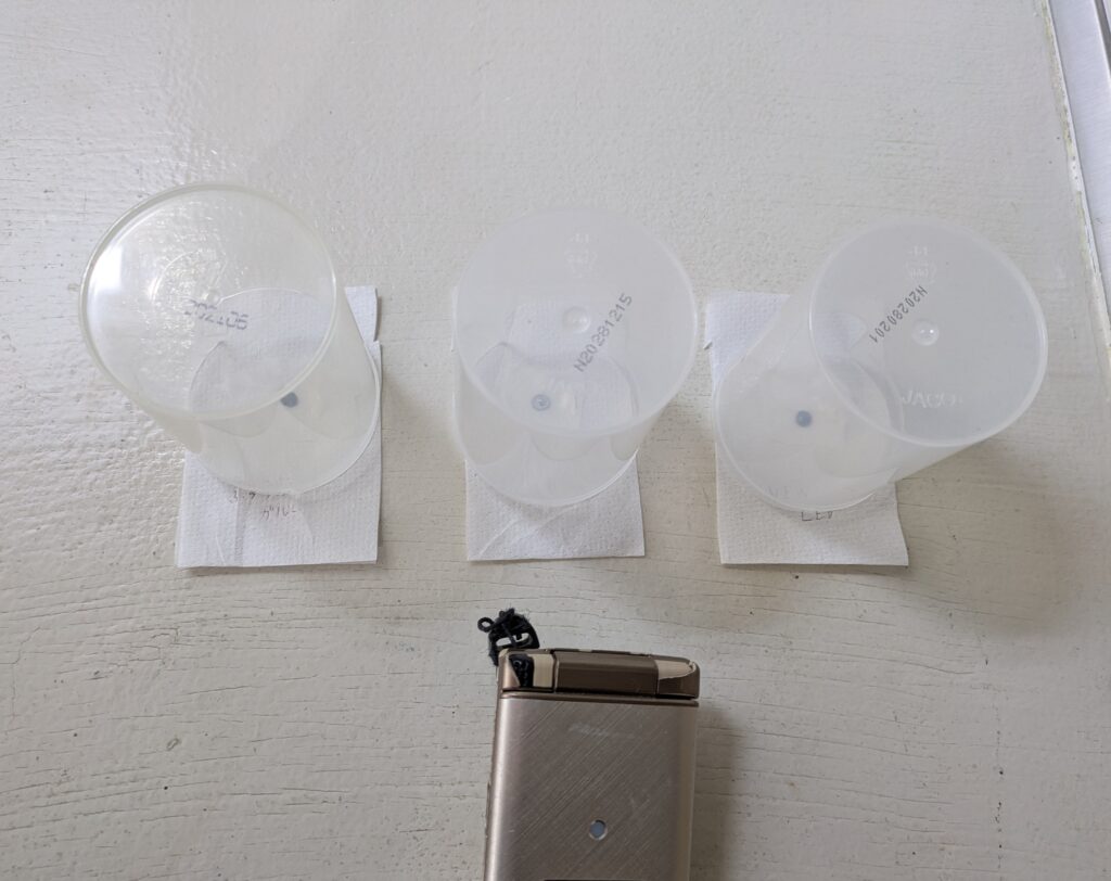 グルーの1cm横に薬剤を置いて、時間経過による変化を調べます。